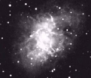 もう一つの超新星残骸は、その代表的な天体の名を付けてかに星雲型と呼ばれます。超新星が起ったときに、その中心に星の核が残る場合があります。恒星ではその巨大な重力を核反応のエネルギーで支えていますが、その核反応の燃料が切れたときに超新星爆発を起し、中心に残った核は自らの重力で収縮していきます。この重力はすさまじいもので、原子の構造さえも破壊し、電子は陽子に取り込まれ中性子となっていきます。元の星の質量がある程度以下だと、収縮は中性子の縮退圧という圧力によって止められます。この状態が中性子星といわれる中性子の塊の星です。この星はわすか10km程の直径の中に太陽1個分よりまだ多い質量を含みます。さらに質量が大きいと中性子の縮退圧でも収縮は止まらず、物質はシュバルツシルド半径と言われる事象の地平の彼方へ落ち込んでいってしまいます。この中からはあまりの重力ゆえに光すら脱出することができず、その中をうかがうことはできません。これはブラックホールと呼ばれます。かに星雲型超新星残骸の正体は中性子星です