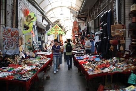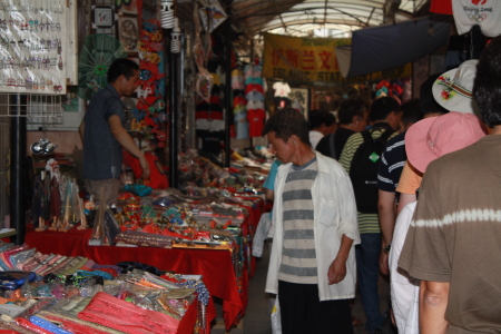 | 清真大寺1 西安最大のイスラム教寺院 へ行くまでの商店街。 幅はせまいが、色々売っており賑やかです。時間があれば物色するのもおもしろい。 |