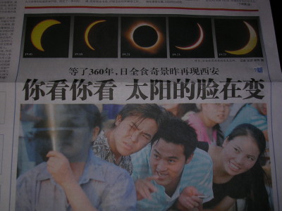 | 銀川のホテルにて 日食伝えた現地の新聞を誰かが 買ってきまいした。 ウィグル地区は見えたようです。 |