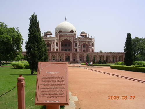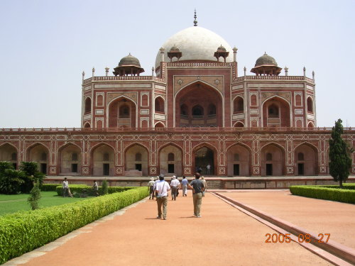 インドは暑い!8月末なのに40℃近くあり直射日光の強さは、日本とは比べものにならない。が湿度が少ないので日影では比較的過ごしやすい。| デリー 世界遺産 フマユーン廟 1565年、ムガル帝国の王妃ハージ・ベグムは死んだ夫(ムガル王朝フマユーン皇帝)のために帝国で最大にして壮麗な廟をヤムナー河の近くに建設したもの。 |