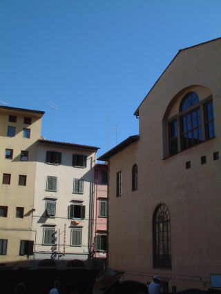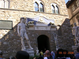シニョーリア広場のダビデ像 となりの少し見えている建物がウフィツィ美術館 手前に見えるのはゴンディ宮 |
